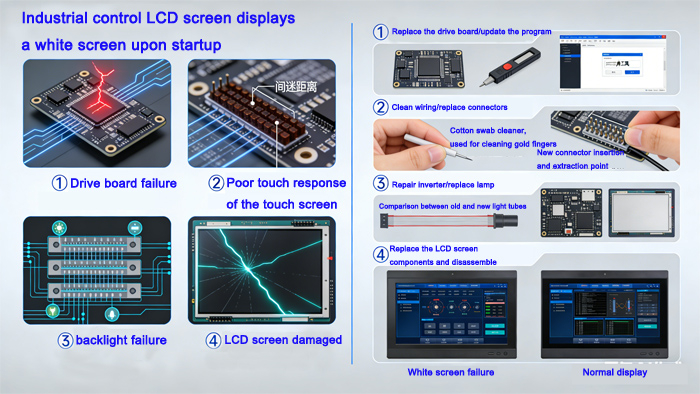 The white screen fault of an LCD industrial control display may be caused by three aspects: issues with the liquid crystal panel drive circuit, issues with the liquid crystal panel power supply circuit, poor contact of the screen cable, and issues with the mainboard control circuit. If the industrial control display can be powered on normally, it indicates that the backlight and high-voltage generation circuit are working properly, suggesting that the liquid crystal panel is not receiving a drive signal. If the screen disappears after turning off the display and a white screen appears subsequently, it may be due to a problem with the power board.